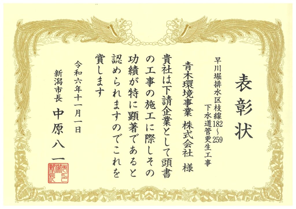 当社はこの度、新潟市から令和6年度優良工事表彰を受賞いたしました。新潟市の下水道管理センターが発注し、アイビス技建株式会社様が請け負った下水道管更生工事において、当社は区長推薦部門で下請け企業の1業者として推薦いただきま …