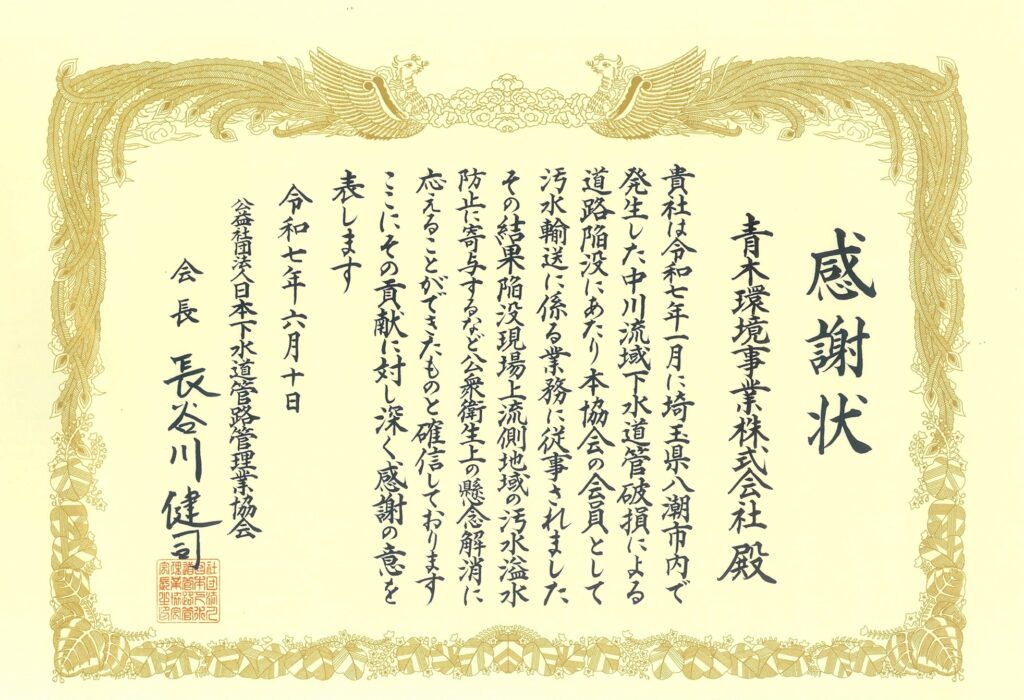 埼玉県八潮市で発生した陥没事故に際して、当社が行った汚水輸送業務に対し、(公社)日本下水道管路管理業協会様より感謝状をいただきました。 今後も地域社会に貢献できるよう、一層尽力してまいります。