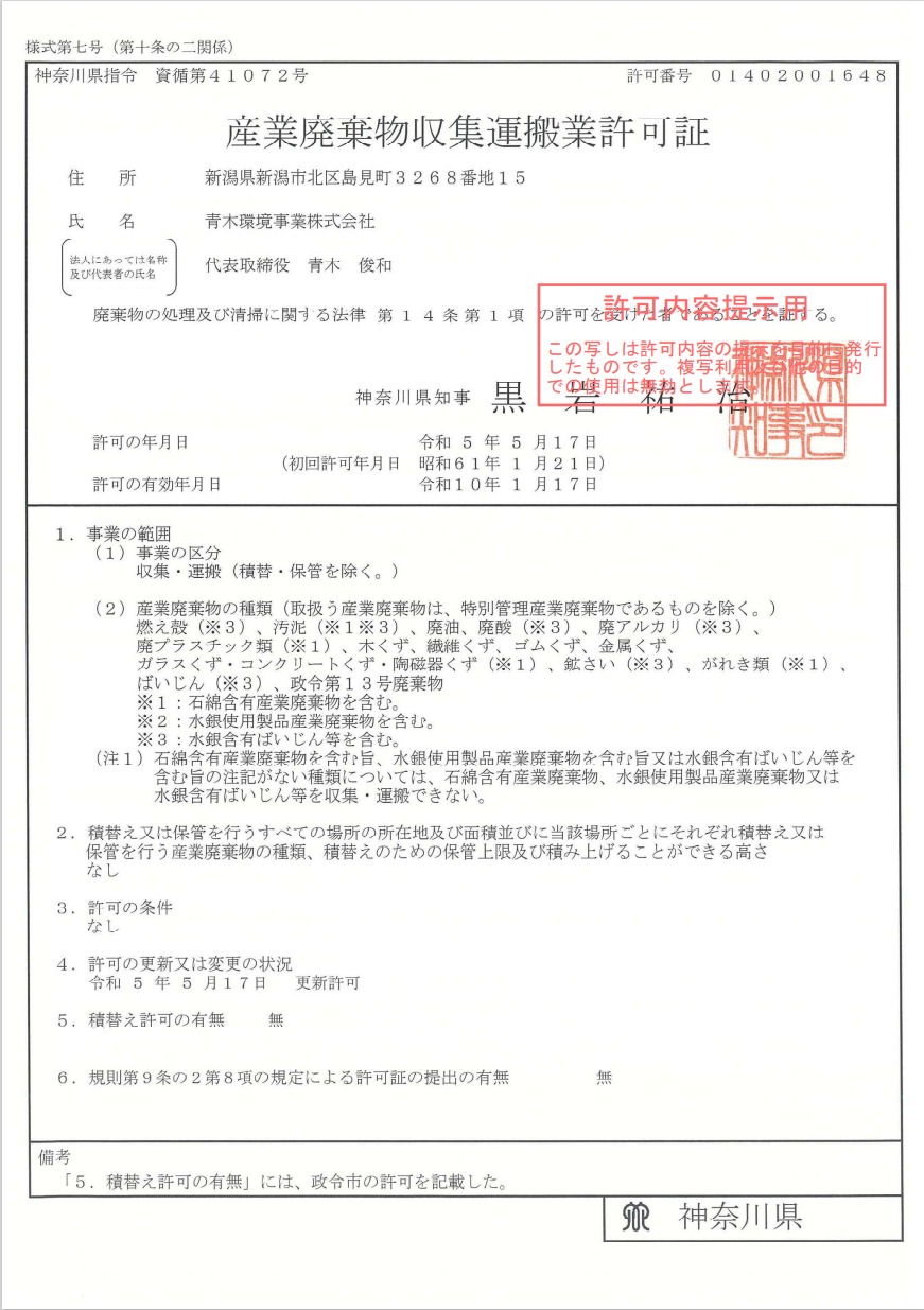 許可更新のお知らせ(神奈川県) 2023年5月20日 このたび、以下の許可を更新しましたのでお知らせします。 ・神奈川県産業廃棄物収集運搬業 ※画像クリックで拡大できます 許可内容等については、下記リンクよりご覧いただけます。 →産廃情報ネット