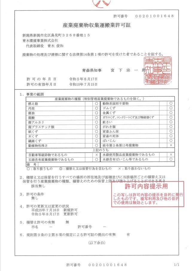 許可更新のお知らせ(青森県) 2023年8月21日 このたび、以下の許可を更新しましたのでお知らせします。 ・青森県産業廃棄物収集運搬業 ※画像クリックで拡大できます 許可内容等については、下記リンクよりご覧いただけます。 →産廃情報ネット