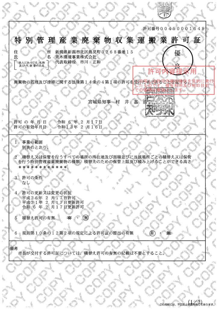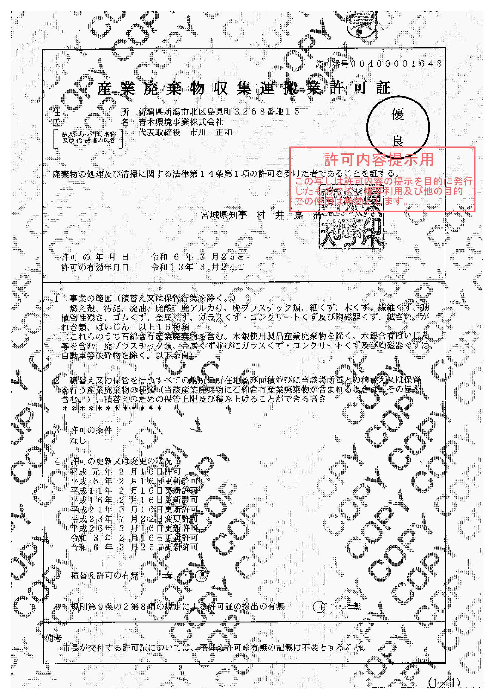 ・宮城県特別管理産業廃棄物収集運搬業(優良)