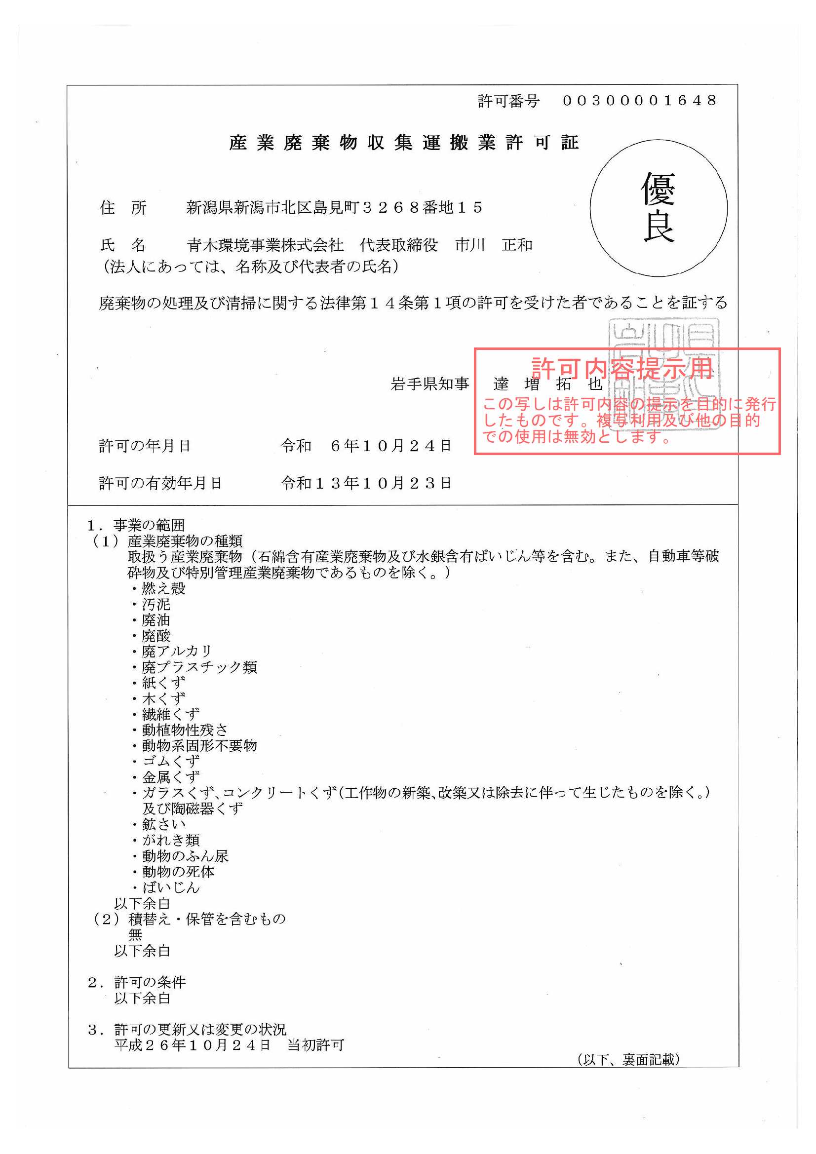 許可更新のお知らせ(岩手県) 2024年11月1日 このたび、以下の許可を更新しましたのでお知らせします。 ・岩手県産業廃棄物収集運搬業(優良) ※画像クリックで拡大できます 各許可の詳細については以下のリンクよりご覧いただけます。 → 産廃情報ネット