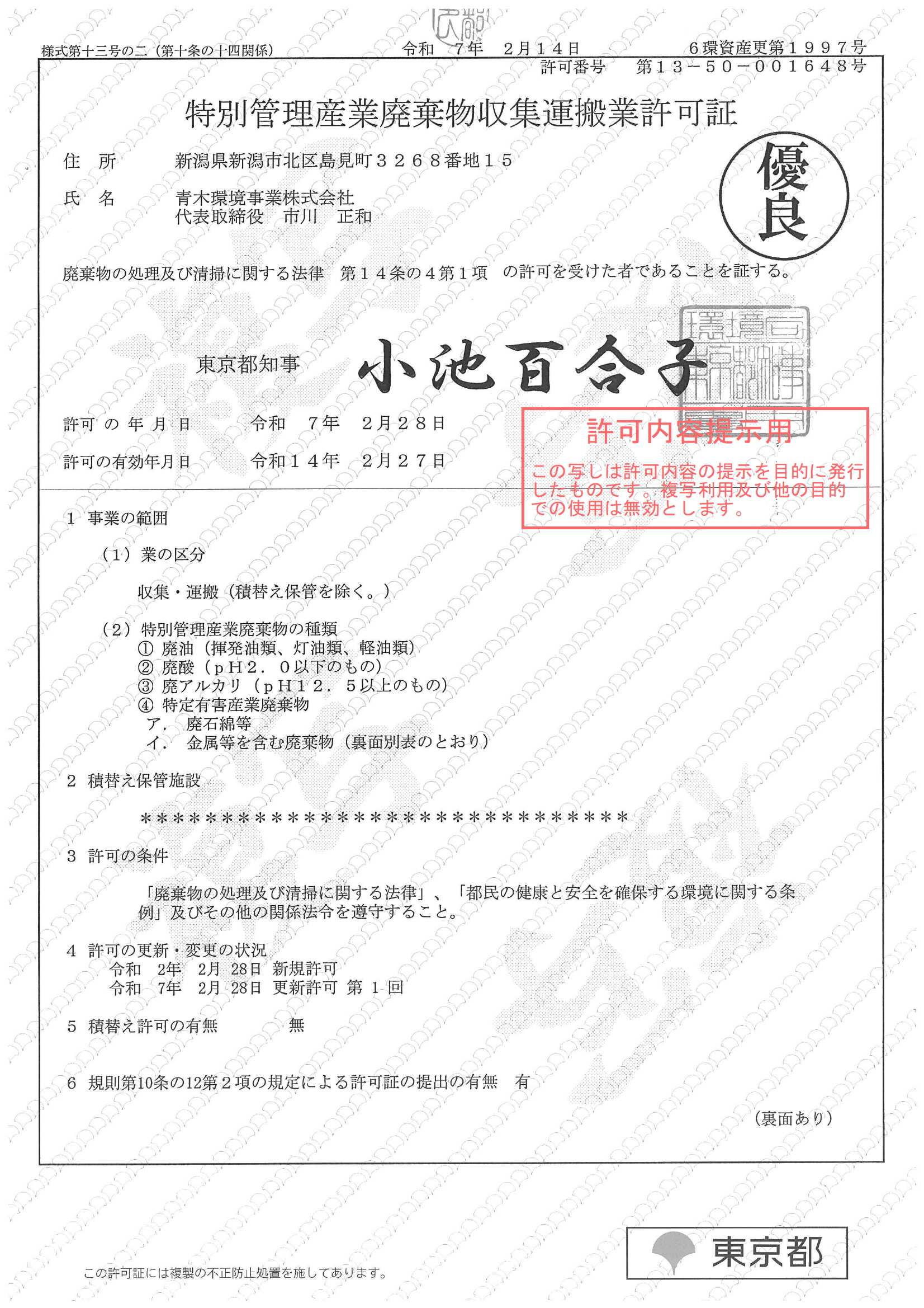 ・東京都特別管理産業廃棄物収集運搬業(優良)