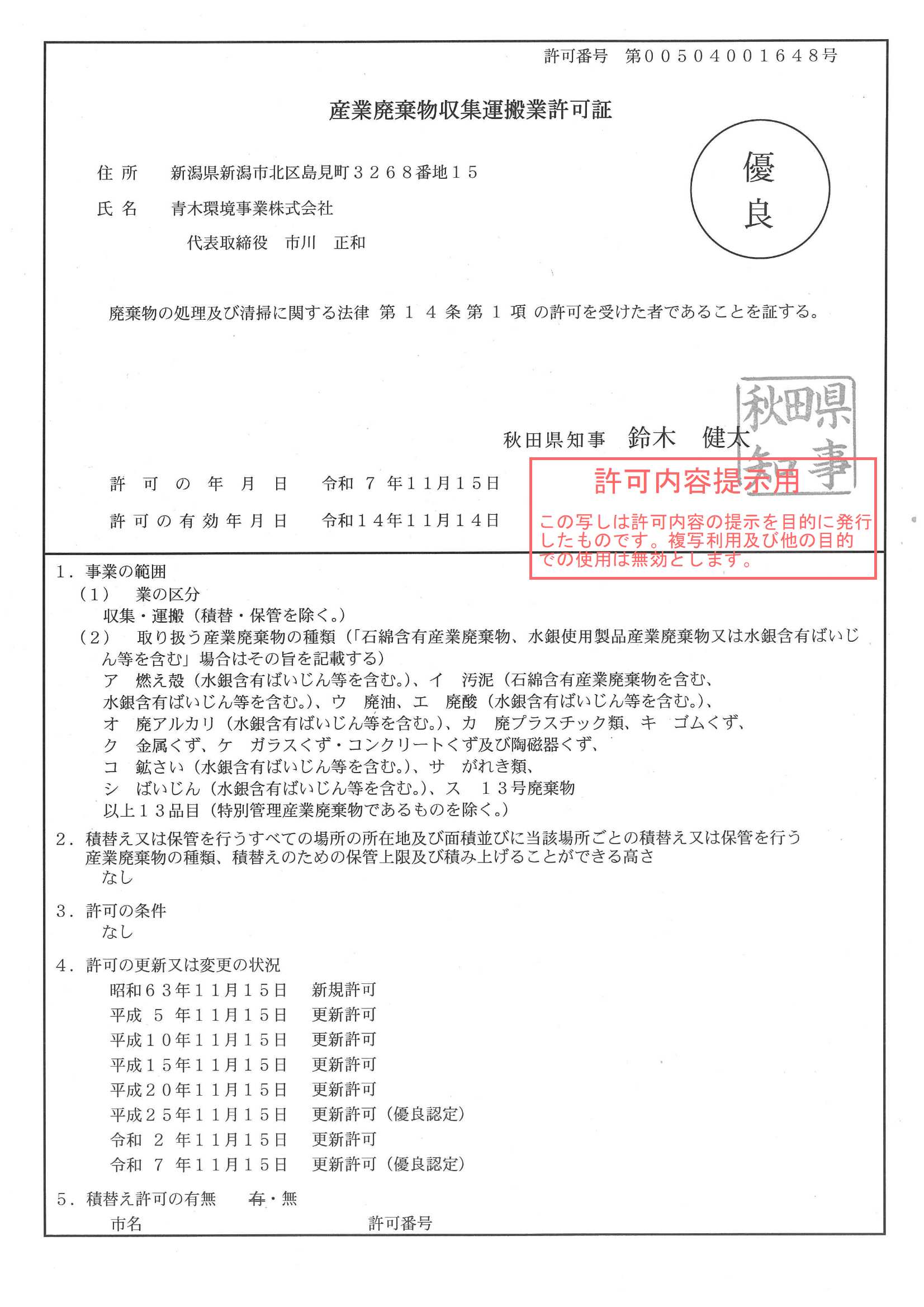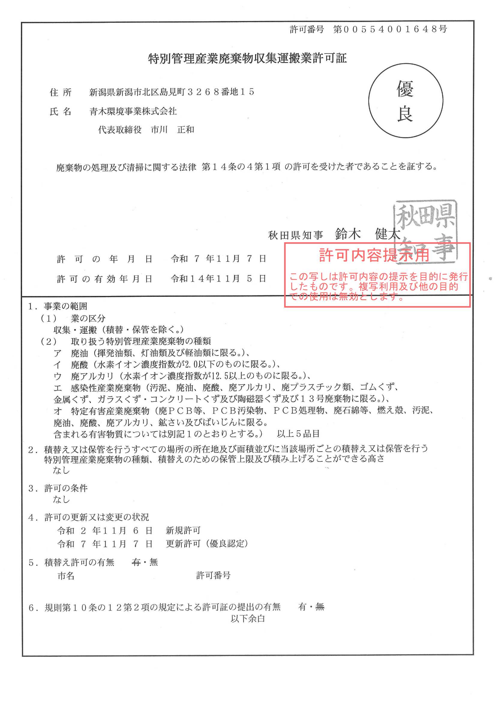 ・秋田県特別管理産業廃棄物収集運搬業(優良)