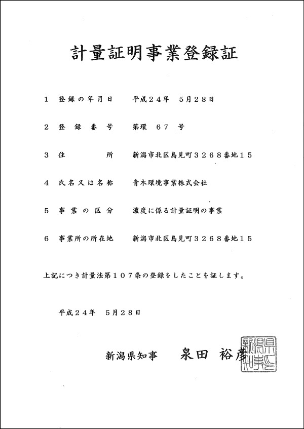 計量証明事業(濃度)の登録を行い、公正かつ円滑な分析業務を心がけています。